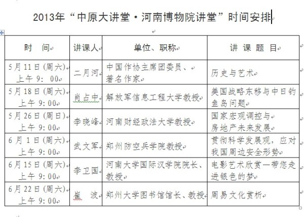 2013年“中原大講堂·河南博物院講堂”具體安排如下:5月11日由中國(guó)作協(xié)主席團(tuán)委員、著名作家二月河主講《歷史與藝術(shù)》;5月18日由解放軍信息工程大學(xué)肖占中教授主講《美國(guó)戰(zhàn)略東移與中日釣魚(yú)島問(wèn)題》;5月26日由河南財(cái)經(jīng)政法大學(xué)李曉峰教授主講《國(guó)家宏觀調(diào)控與房地產(chǎn)未來(lái)發(fā)展》;6月1日由鄭州防空兵學(xué)院武文軍教授主講《貫徹科學(xué)發(fā)展觀,應(yīng)對(duì)我國(guó)周邊安全形勢(shì)》;6月15日由河南大學(xué)國(guó)際漢學(xué)院李衛(wèi)國(guó)院長(zhǎng)主講《電影藝術(shù)欣賞—帶您走進(jìn)銀色的夢(mèng)》;6月22日由鄭州大學(xué)圖書(shū)館崔波館長(zhǎng)主講《周易文化賞析》。