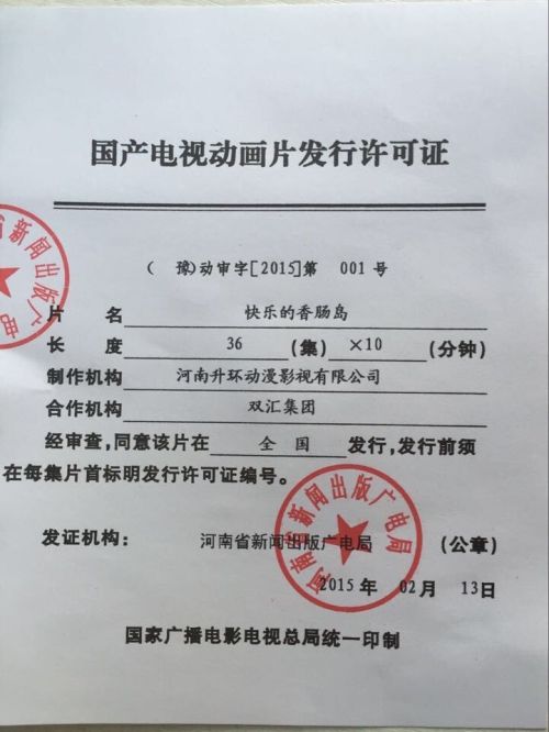 2015年2月13日,河南升環動漫影視有限公司迎來了一個喜慶的日子:河南省新聞出版廣電局把2015年001號動畫片發行許可證頒給升環動漫與雙匯集團聯合打造的動畫片《快樂的香腸島》,又名《雙匯大森林》。