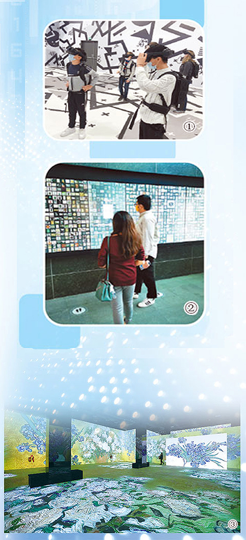 圖②:2021年12月5日,位于菲律賓首都馬尼拉的阿亞拉博物館大廳內,一面由8塊可伸展屏幕組成的數字觸摸畫廊吸引人們駐足觀看。影像中國