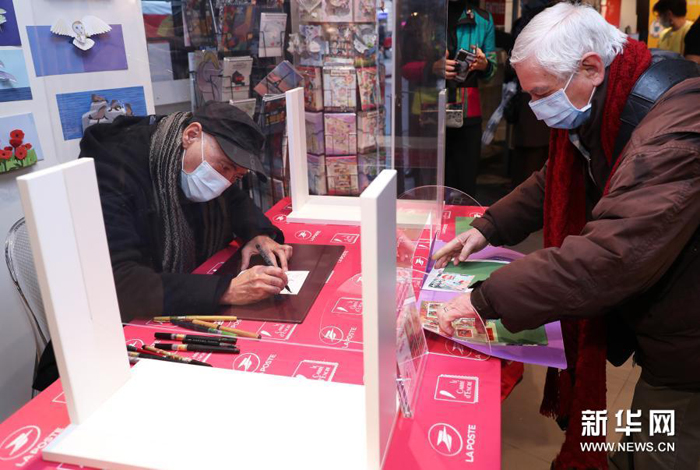 在法國巴黎舉行的牛年生肖郵票發(fā)行儀式上,郵票設(shè)計者陳江洪為集郵愛好者簽售牛年生肖紀(jì)念郵票。