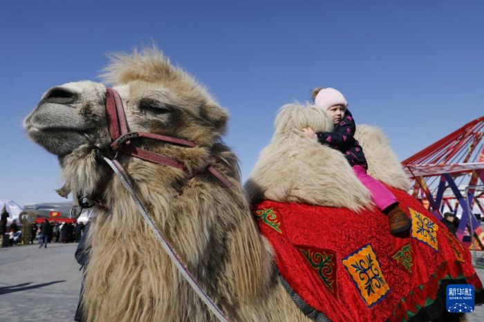 3月22日,在哈薩克斯坦首都阿斯塔納,一名兒童體驗騎駱駝。