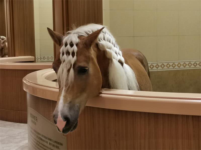 馬兒們就在這舒適的環(huán)境里快樂(lè)地生活著。衣食無(wú)憂,愛(ài)美之心,馬也有之!梳妝打扮起來(lái),不亞于美女!有染毛發(fā)的,有編辮子的,還有插花的……寂寞時(shí),還能交交頭,咬咬耳朵,這里簡(jiǎn)直就是馬的“高檔小區(qū)”“五星級(jí)賓館”!