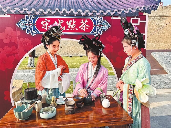 4月11日,安陽市漢服文化暨非遺技藝展演活動上,漢服秀演員在展示點茶技藝。 趙阿娜 攝