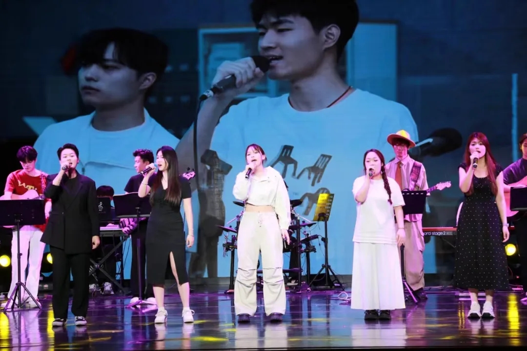 本場演出中,多數(shù)節(jié)目由學生樂隊伴奏;有合作曲目,也有個人solo;部分學生還參與到和聲的部分。演出曲目多是受年輕人喜愛的、當下傳播廣泛的流行音樂,如告五人樂隊的《帶我去找夜生活》、周杰倫的經(jīng)典作《彩虹》、八三夭樂隊的《想見你想見你想見你》等。熟悉的樂曲瞬間點燃現(xiàn)場觀眾的熱情,不自覺地跟著臺上歌手一起唱起來,感受著音樂帶來的快樂和感動。